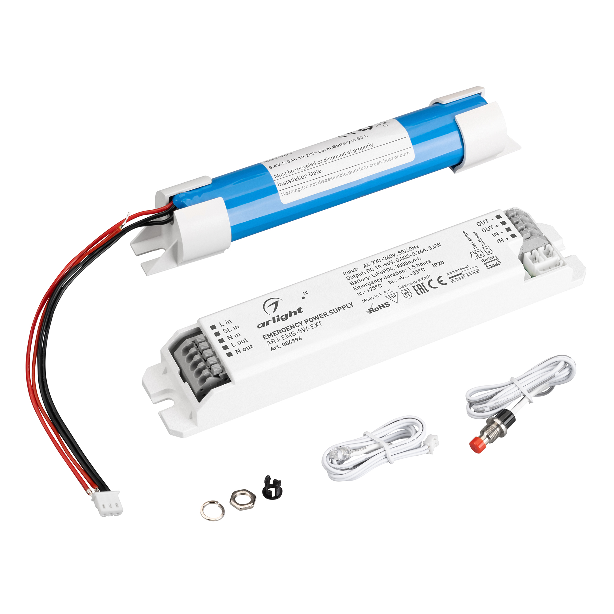Поставка под заказ от 500шт. Блок аварийного питания с гальванической развязкой для светильников и мощных светодиодов. Входное напряжение 220-240 VAC. Выходные параметры: 5.5Вт, 10-90 В, 5-260 mА. Негерметичный пластиковый корпус с внешней аккумуляторной батареей IP 20. Ёмкость батареи 3000 мА/ч, время работы от АКБ до 1.5, потребляемая мощность в режиме заряда батареи 7Вт. Габаритные размеры длина 162 мм, ширина 31 мм, высота 21 мм (габаритные размеры АКБ 90x20x21мм). Гарантийный срок 3 года.