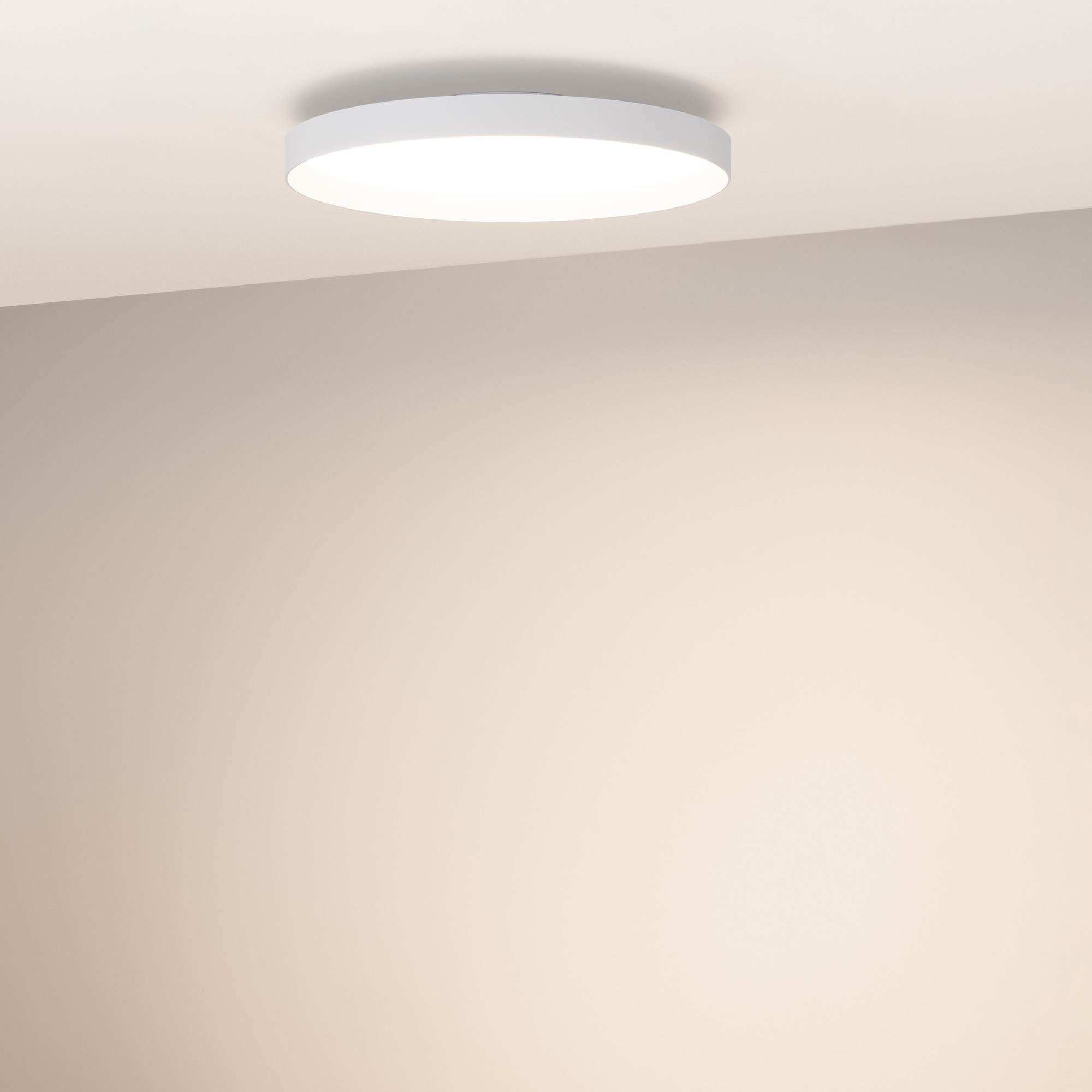 Светодиодный накладной светильник с изменяемой цветовой температурой. Мощность 40 Вт, св. поток 3018-3305 лм, 80-85 лм/Вт, теплый 2700 K, теплый 3300 K, дневной 4000K (переключается), CRI>92, угол 80°, напряжение питания 230 В. Белый круглый корпус из алюминия, матовый призматический экран PC, степень защиты IP20. Размер: Ø 450х70 мм. Размер световой части: Ø 450х39 мм, размер основания: Ø 196х31мм. Монтаж накладной. Драйвер 9-38 В, 1050 мА, пульсация <0,3%. Диммирование TRIAC.