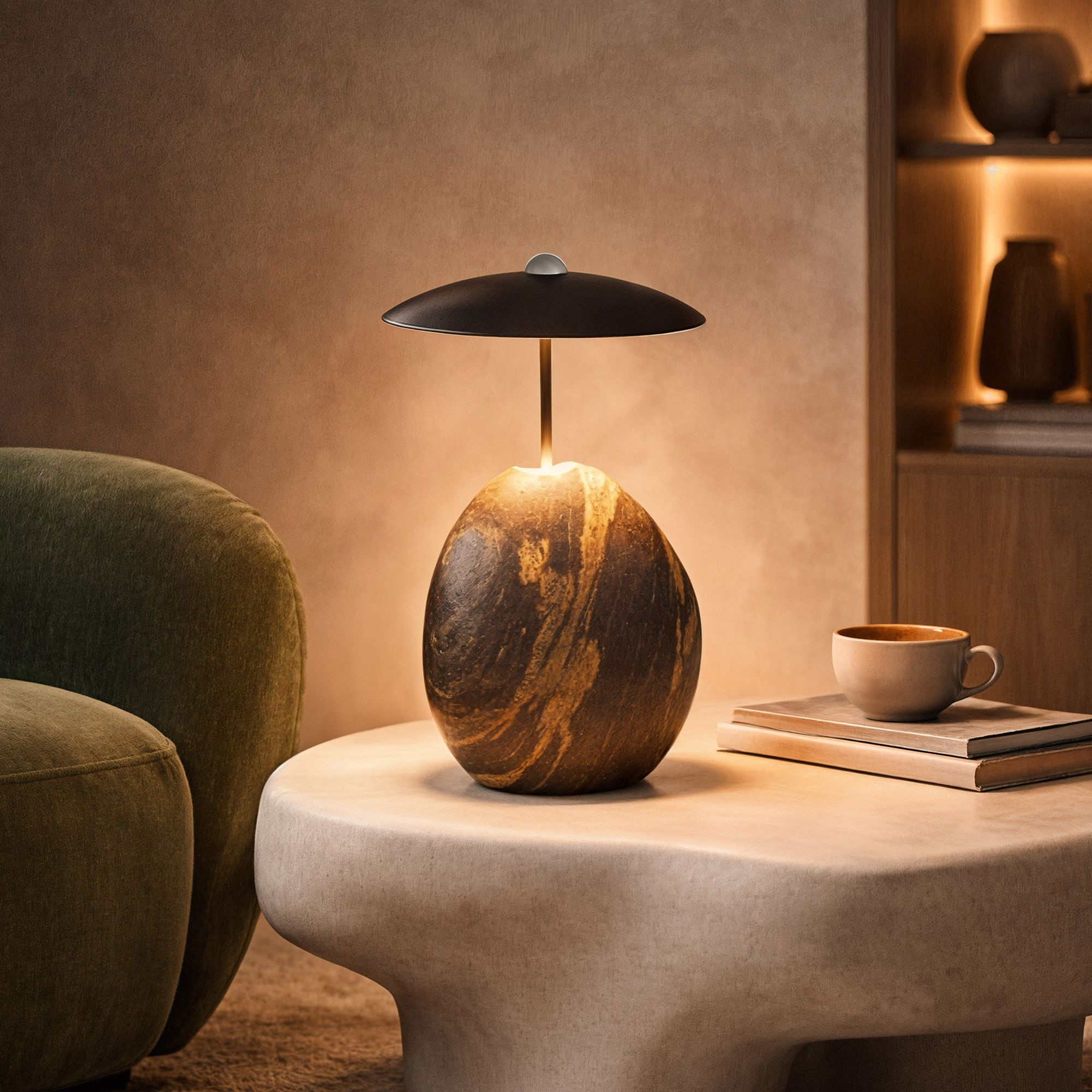 Настольный светильник UMANI. Мощность 6 Вт, св. поток 10,4 лм, 2 лм/Вт, теплый 2700К, CRI>92, угол 90°, напряжение питания 230 В. Черный рессеиватель из металла. Основание светильника выполнено из натурального камня, каждый экземпляр уникален своей неповторимой формой и текстурой. Степень защиты IP20. Диаметр рассеивателя: 250 мм. Общая высота: 340 мм. Высота основания: 190 - 230 мм. Диаметр основания: 160 - 200 мм. Длина кабеля 2м. Пульсация <5%.